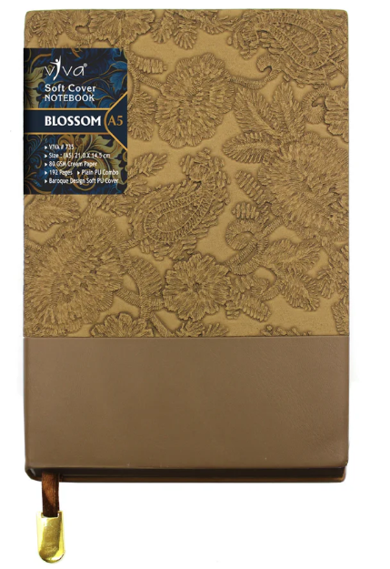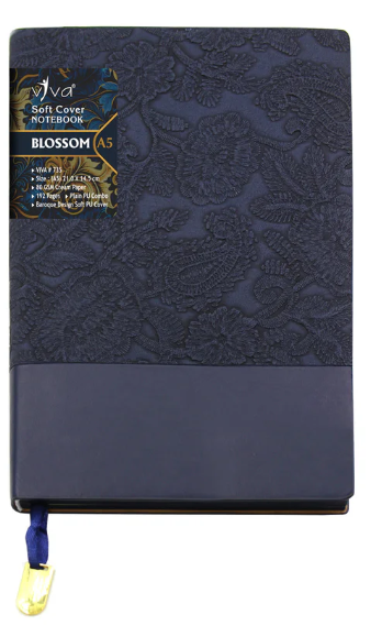 The BLOSSOM Journal Notebook (Product Code – VIVA #735) is an elegant and functional A5-sized (21.0 cm X 14.5 cm) notebook designed for those who appreciate sophistication in their stationery. Crafted with 80 GSM cream paper and 192 pages (96 sheets), it includes information, ruled, dotted, and perforated pages to suit various writing and planning needs. The plain PU combo cover with a luxurious Baroque design gives it a distinctive charm, while the soft PU material adds a premium touch. Available in three refined colors – Camel, Black, and Blue – the BLOSSOM Journal is the perfect blend of style and practicality.