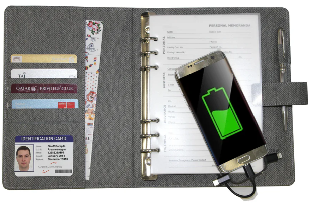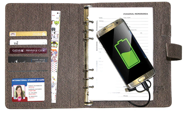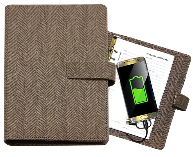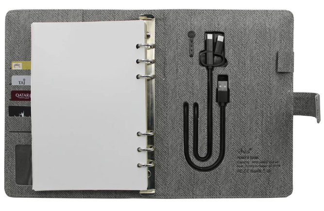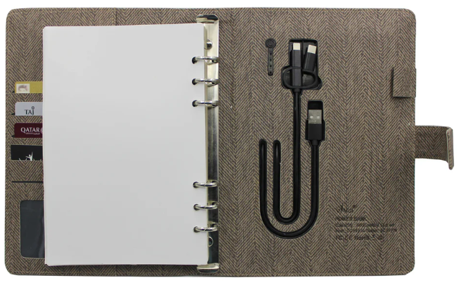 The CHARGE Power Bank Ringbinder Notebook is a smart and multi-functional corporate essential, combining a high-capacity power bank with a hidden USB flash drive for seamless data storage. Featuring built-in charging cables, a stylish magnetic loop closure, and a refillable 6-ring mechanism, this notebook is designed for professionals who value efficiency and innovation. Perfect for business executives, travelers, and digital nomads, offering power, storage, and productivity in one premium package.