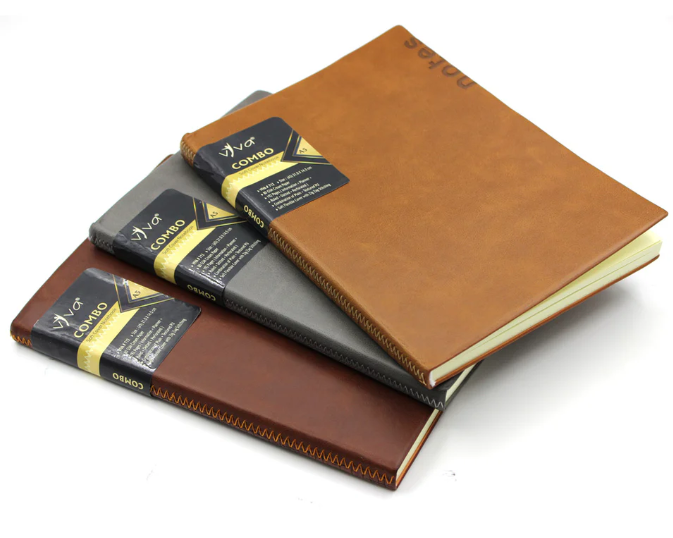 The COMBO Journal Notebook (Product Code – VIVA #712) is a perfect fusion of style and utility. This A5-sized (21.0 cm X 14.5 cm) journal features 80 GSM cream paper with 192 pages (96 sheets), offering a versatile combination of information, planner, ruled, dotted, and perforated pages to cater to diverse writing needs. The soft flexible cover, crafted with a combination of plain and textured PU material, enhances its durability and aesthetic appeal. The zigzag stitches on the spine add a refined design touch. Available in three sophisticated colors – Brown, Tan, and Grey – the COMBO Journal is an ideal choice for professionals and creatives alike.