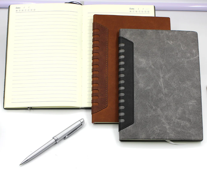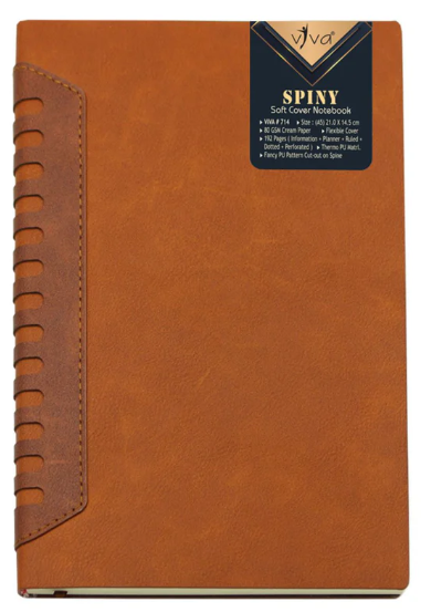 The SPINY Journal Notebook (Product Code – VIVA #714) is a refined A5-sized (21.0 cm X 14.5 cm) notebook designed for those who appreciate elegance and practicality. Crafted with 80 GSM cream paper and 192 pages (96 sheets), it offers a seamless combination of information, planner, ruled, dotted, and perforated pages to suit diverse writing needs. The soft flexible cover made from premium 2-tone PU material exudes sophistication, while the fancy PU pattern cut-out on the spine adds a unique design element. Available in two classic shades – Grey and Tan – the SPINY Journal is a stylish and functional choice for professionals and creatives alike.